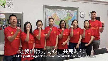 闫嵩(左一)老师与英国赫尔孔子公司同事们发来的祝福视频