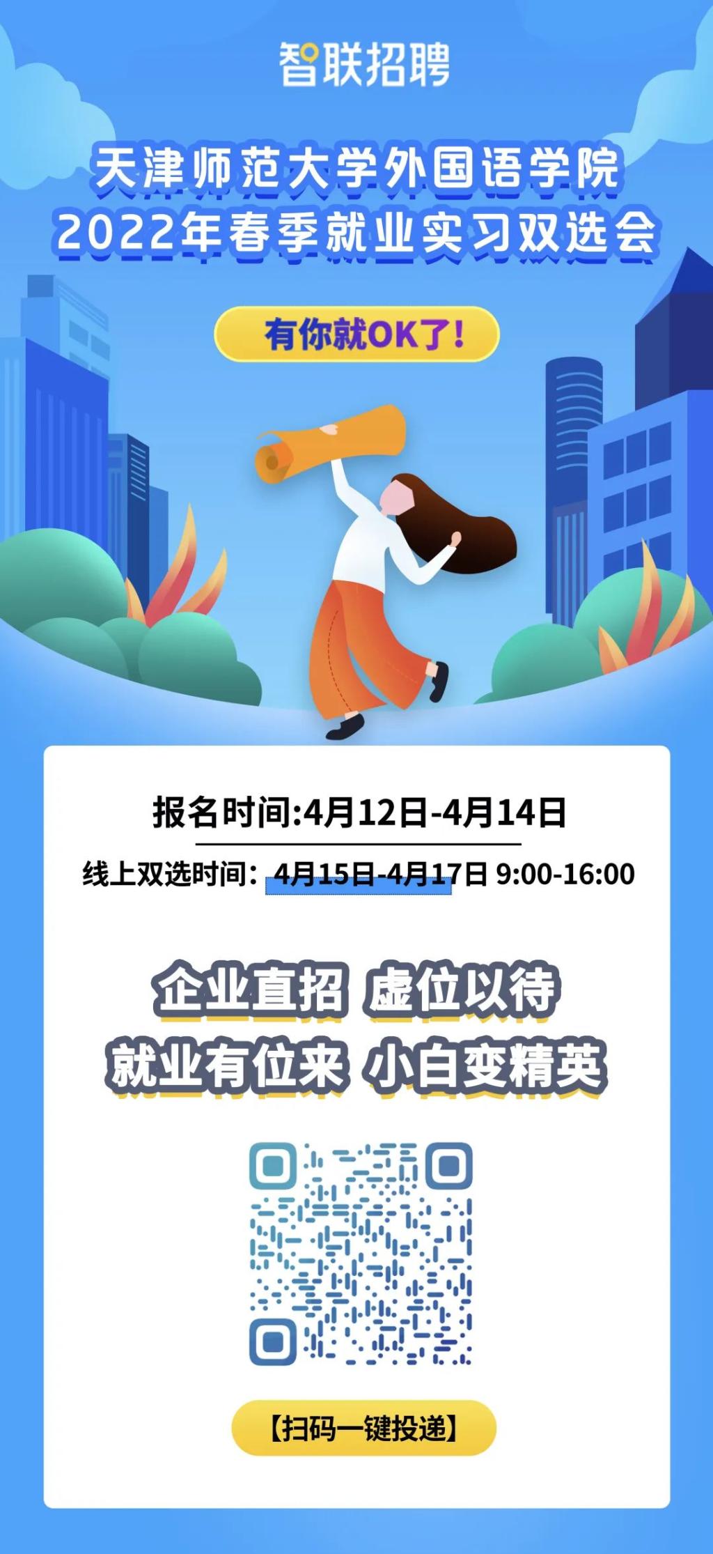 1.本次双选会对用人单位免费开放,报名截止至2022年4月10日17:00。用人单位报名成功后如因特殊情况需取消参加,请在举办之日前两天告知主办方。