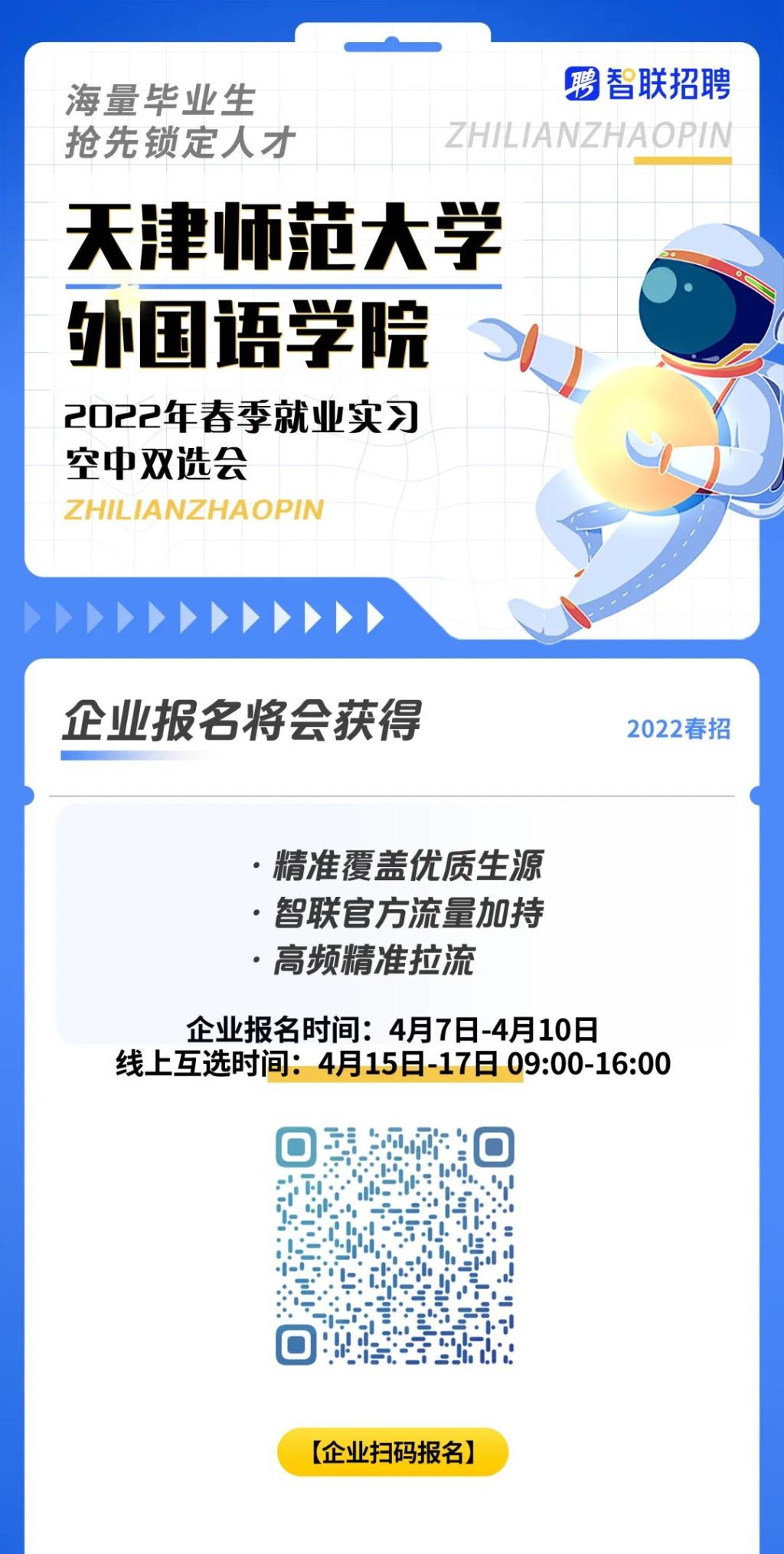 为搭建毕业生和用人单位之间的双向选择平台,实现精准推荐、精准对接、合作共赢,全力做好线上招聘的组织与服务。beat365亚洲体育特联合智联招聘定于2022年4月15日-17日举办“2022年春季空中就业实习双选会”,现诚挚邀请贵单位前来公司招聘英才。