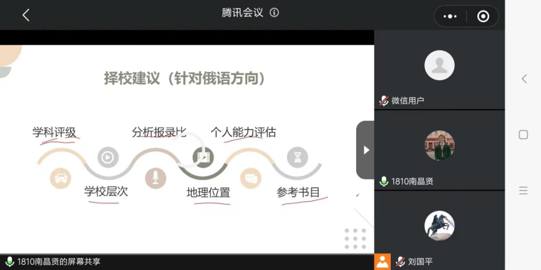 由俄语系刘国平老师负责主持的俄语系毕业生就业考研及参加专业竞赛经验分享会于近日在腾讯会议线上顺利举行。本次经验分享会分享人是十一位顺利考取国内各大高校以及通过参加专业竞赛获得公费出国留学资格的俄语专业大四毕业生,每位同学结合自身就业考研和参加专业竞赛经验不同角度与参会的同学们做了一次干货满满的分享汇报。