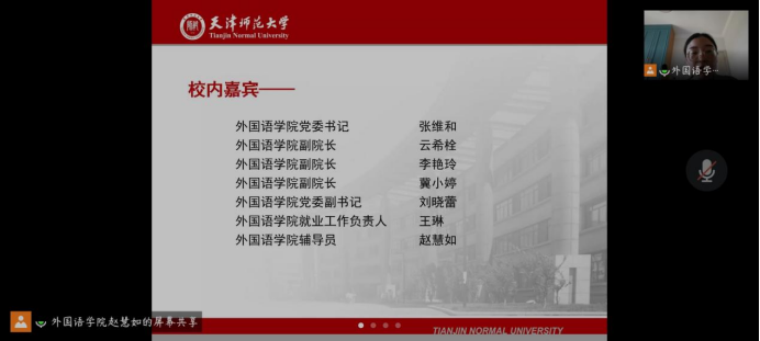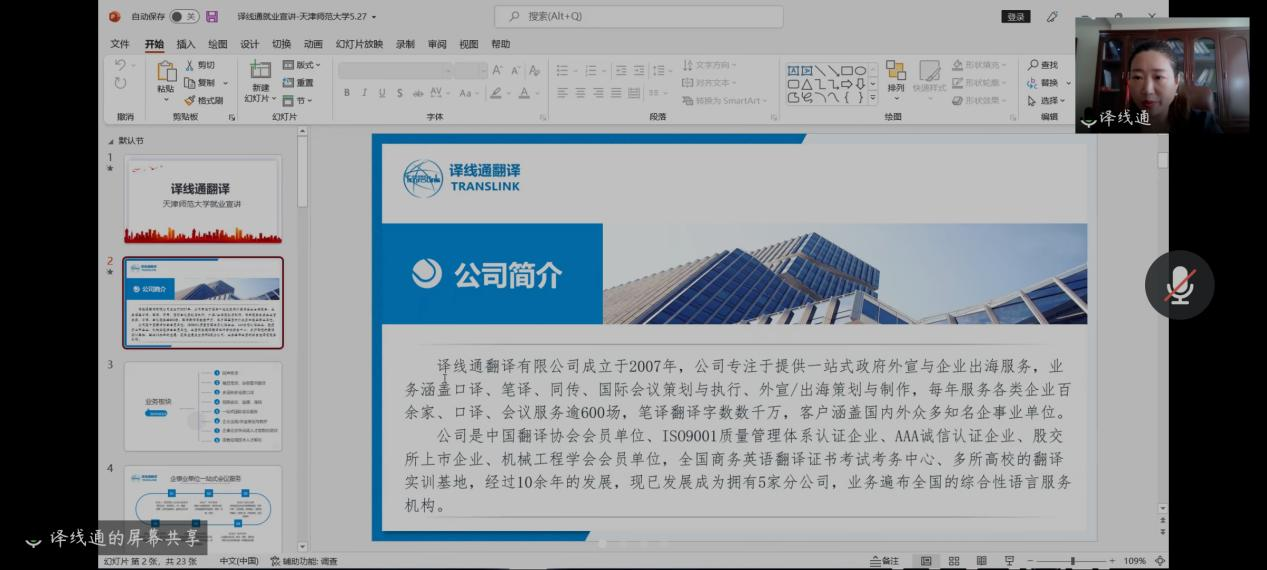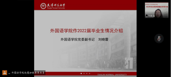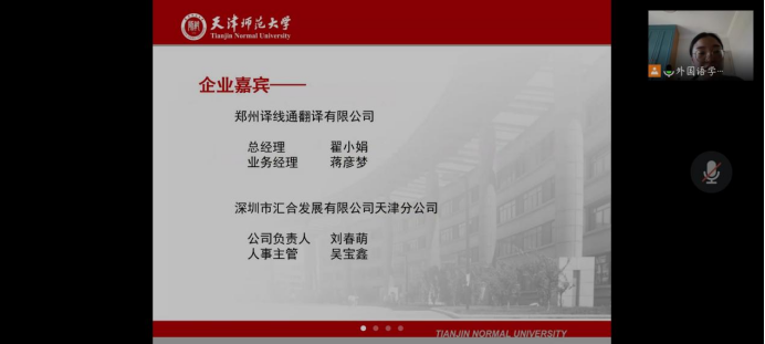 活动伊始,刘晓蕾老师为各位与会嘉宾介绍了公司2022届毕业生情况。郑州译线通翻译有限公司与深圳市汇合发展有限公司天津分公司相继介绍本单位情况及2022届毕业生招聘需求。随后,公司领导与企业代表就双方关心的问题进行洽谈交流,增进了双方的认识和交流。