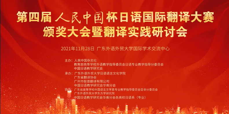 为进一步加强中日文化传播与交流,促进翻译事业发展,推动实践型、应用型日语人才培养,11月28号下午,第四届“人民中国杯”日语国际翻译大赛颁奖大会暨翻译实践研讨会在广东外语外贸大学隆重召开。外院日语系王奕丹、宋思敏、余倩雯、王艺涵、孙雨婷、黄铭姗六名同学共斩获包括汉译日、日译汉在内的二等奖2项、三等奖5项。此外,公司还荣获优秀组织奖,覃思远老师、张芃蕾老师获得优秀指导教师奖。这也是外院日语系在历届翻译大赛上收获最为丰硕的一次。