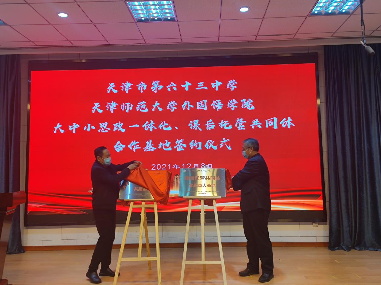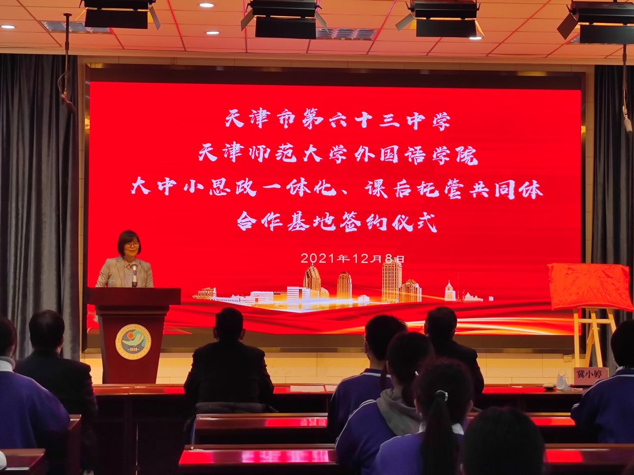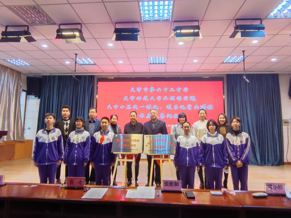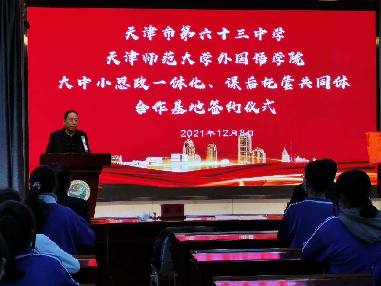 为更好落实立德树人根本任务,积极培育和践行社会主义核心价值观,充分发挥思政课育人的主渠道作用。公司携手天津市第六十三中学,共同探索实践“大中小思政一体化”建设,全力打造课后托管共同体。12月8日下午,合作共建签约仪式在天津市第六十三中学举行,党委书记张维和、党委副书记刘晓蕾、副经理冀小婷和团委书记宋倩,以及第六十三中学书记崔涛和相关负责老师、员工代表参加活动。