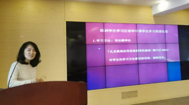 王虹老师首先从学习方法、以及母语或二语对外语学习的负迁移这两方面,针对欧洲员工学习汉语和中国员工学习英语进行了比较,提出教师对员工的学习方法要“因势利导,顺势而为”的理念。王虹老师介绍,“胜任力”的概念是“能够将工作岗位上表现优秀者与表现普通者区分开来的潜在的、深层次的个人特征”,比如“知识、技能、角色定位、价值观、动机、个人特质”等,并介绍国外学者对教师胜任力的相关研究,例如“受员工喜爱的教师所具有的特征”、“教师入职胜任力指标体系”、“称职与不称职教师特征的对比研究”、“高绩效教师胜任力特征模型”、“教师胜任力评价标准”等。最后,王虹老师提出作为高校外语专业教师应做到在教学上“化繁为简”,在研究上“由简入繁”,心系一处,一心一意、精益求精地做好教学和研究。